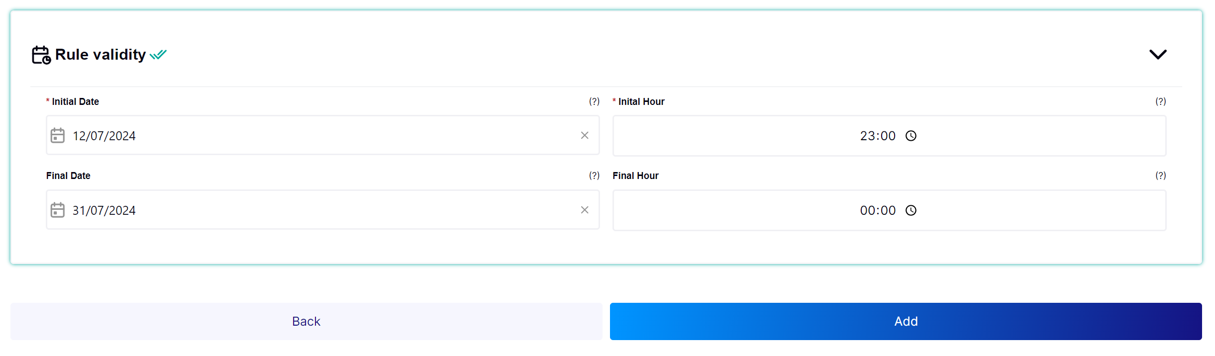 Finally, specify the validity period, indicating the start and end date and time of the rule.